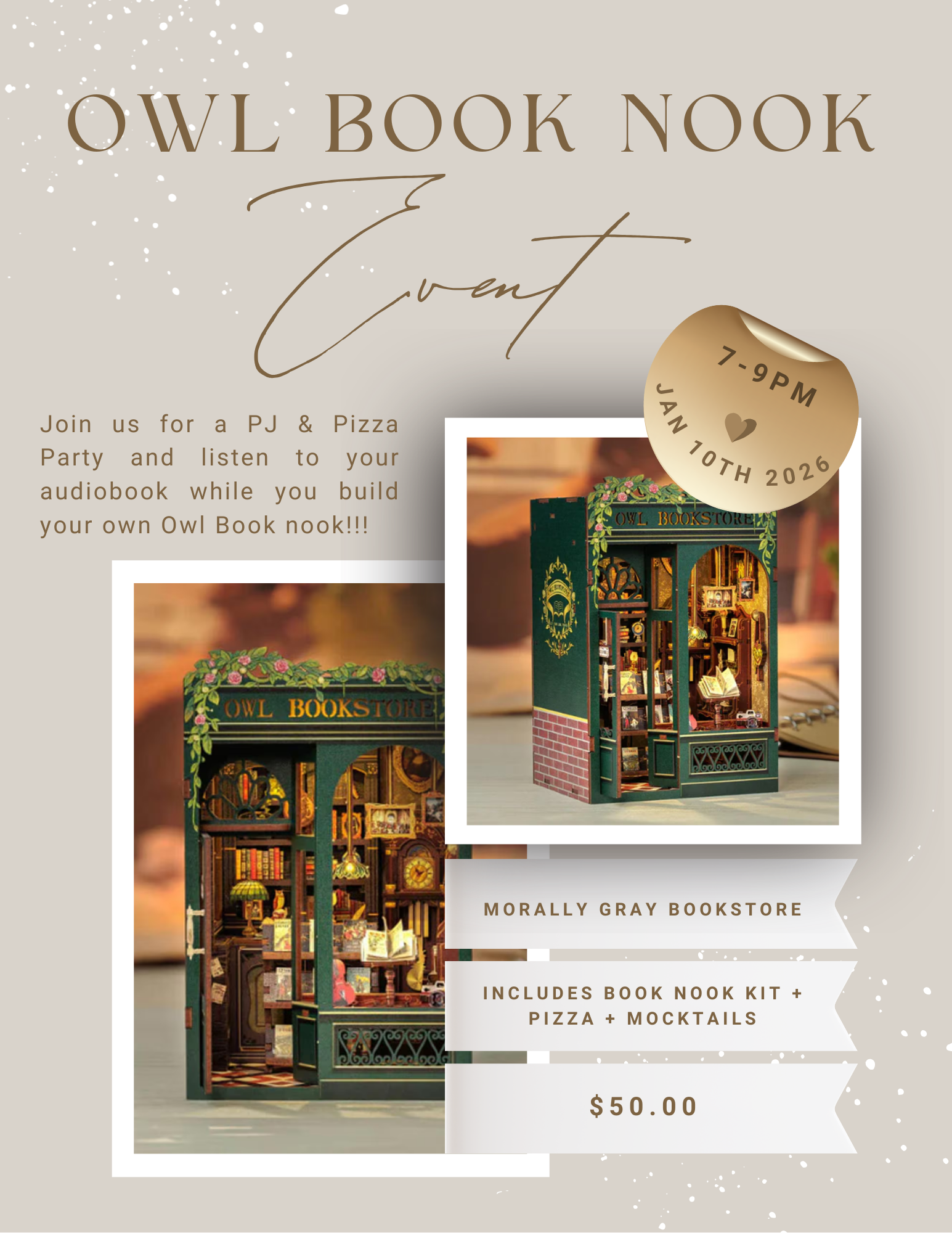 Join us for a PJ & Pizza Party and listen to your audiobook while you build your own Owl Book nook!!!