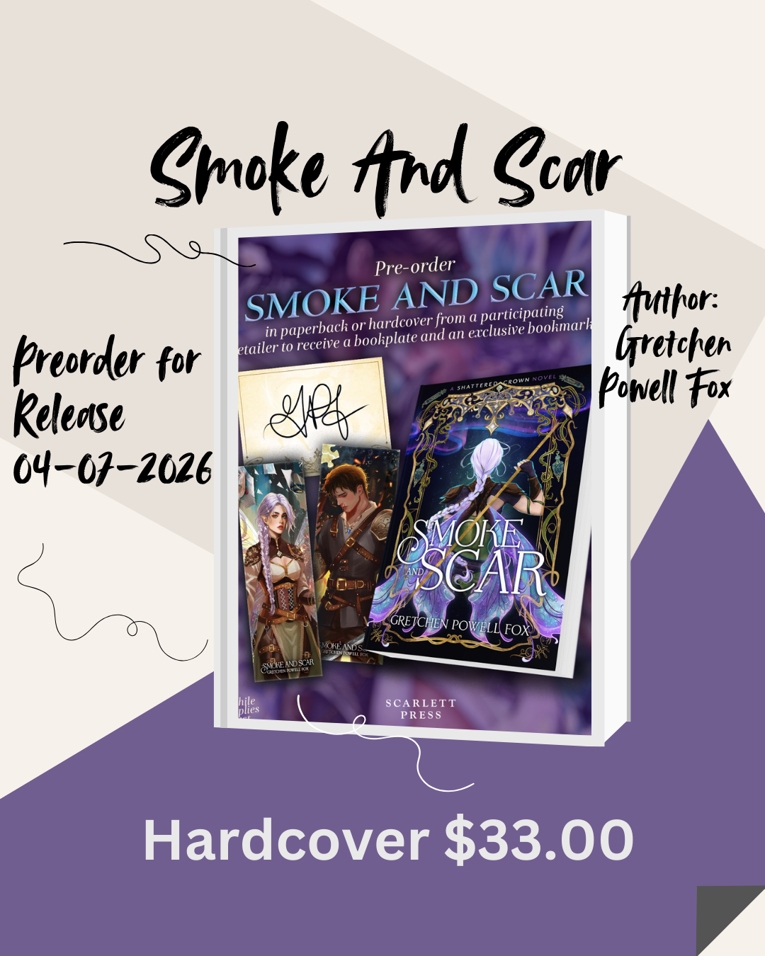 This is for a preorder of a hardcover copy of Smoke And Scar by Gretchen Powell Fox that will release on 4/7/26. All preorders will receive a signed bookplate and special bookmark from the author.